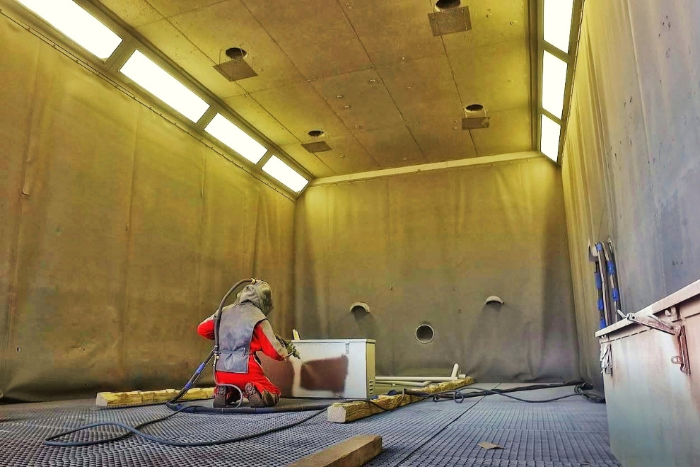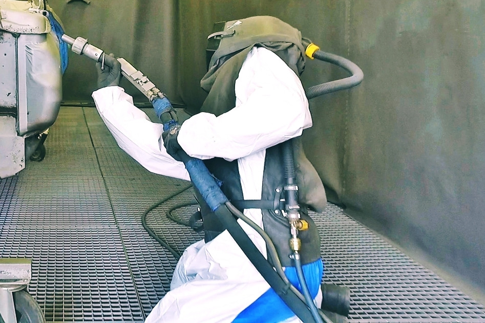 in grossräumiger Sandstrahlkabine oder mit mobilem Sandstrahlgerät.